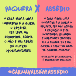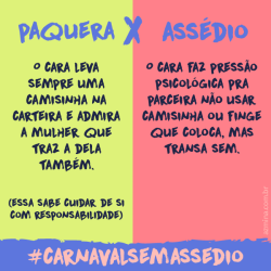 Para ajudar a romper com essa cultura machista a Revista AzMina, o Catraca Livre, os movimentos ?#AgoraÉQueSãoElas?, Vamos Juntas? e Bloco das Mulheres Rodadas lançaram um guia didático com as diferenças entre paquerar e assediar. Por um carnaval com conquistas saudáveis.
